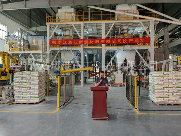 儀式結束后,大家走進了漣江新型材料有限公司的生產車間進行參觀,從青島環港重工科技有限公司采購的一條6方機、一條4方機石膏砂漿設備已實現智能化生產。